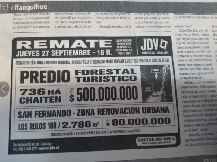 Conversando con la empresa de remate el lunes 25, y cuestionándoles la cabida de hectáreas porque a parecer nos parecía que eran menos (se rematan 736 hectáreas), el encargado de remates de bienes raíces de la empresa, argumentó que eso no era posible, porque además “cuando publicamos el aviso la semana pasada, incluso nos llamaron de Bienes Nacionales para reclamarnos porque ellos dicen que son más de mil (hectáreas)”, lo cual hace suponer que de esta operación, al menos algunos funcionarios de ese ministerio estaban al tanto y muy pendientes, por lo cual sospechamos además que fueron parte de esta extraña operación que, una vez más, va en desmedro de los pobladores y colonos de Chaitén.