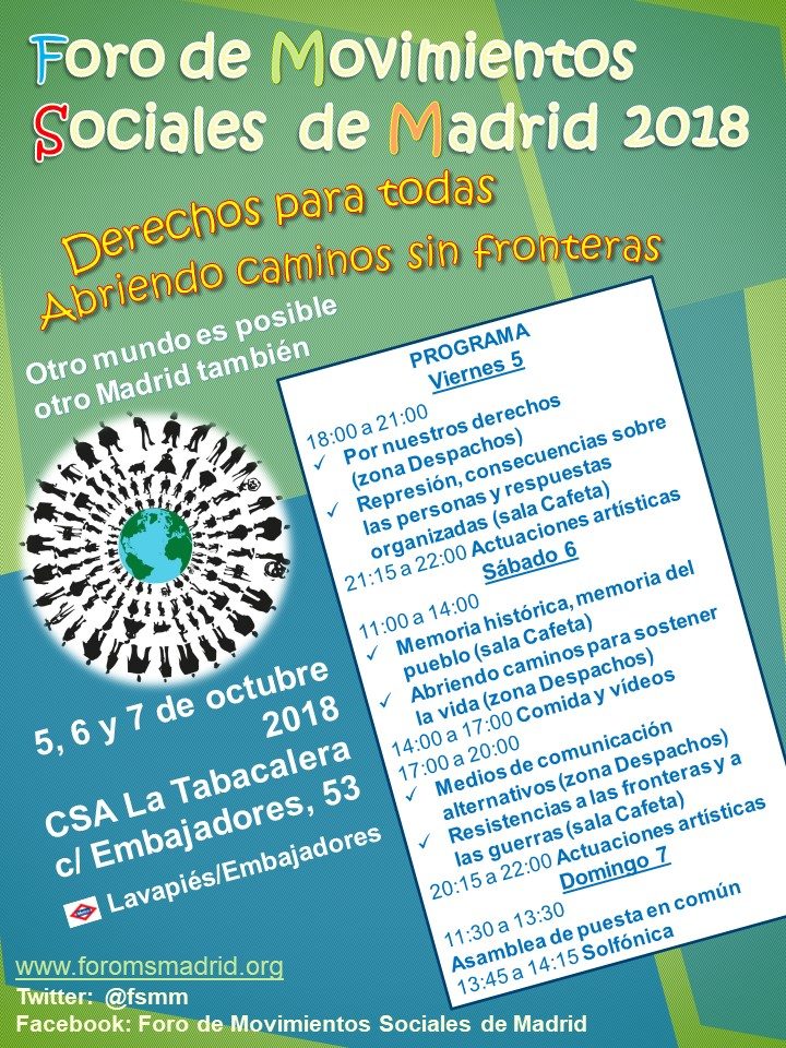El próximo fin de semana, del viernes 5 por la tarde hasta el domingo 7 de octubre, tendrá lugar una nueva edición del Foro de Movimientos Sociales de Madrid. Será en las instalaciones de la Tabacalera y contará con diferentes ejes temáticos, como puede verse en el cartel.