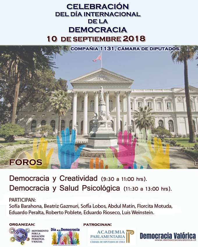 En Chile hemos tomado la iniciativa de ciudadanizar dicha celebración, por lo que partiremos este año celebrándola el Lunes 10 de Septiembre de 9:30 a 13:15, con dos foros de temas ciudadanos: democracia y creatividad, y democracia y salud psicológica, en vínculo con la institucionalidad parlamentaria. La actividad se realizará así en el Ex Congreso en Santiago, y con el patrocinio de la Academia Parlamentaria.