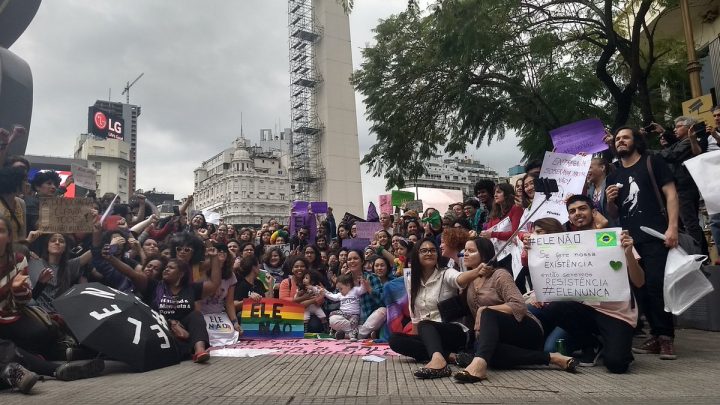 Convocados por el Colectivo Passarinho, centenares de residentes brasileños en Buenos Aires se reunieron este sábado desde las 15 hs. en el Obelisco porteño. #EleNão #EleNunca fue la consigna de la campaña que se desarrolló hoy en distintas capitales del mundo en simultáneo para concientizar acerca del peligro que representa Jair Bolsonaro, candidato para las elecciones presidenciales del próximo 7 de octubre. Se trata de un ex militar que ya se ha pronunciado de modo fascista, machista, misógino y a favor del período de la dictadura en Brasil.