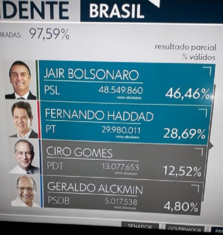Estoy apartando los ojos de la televisión distraído por la vibración de mi condenado teléfono celular. Es una querida amiga de Chile. Su pregunta requeriría una larga explicación. Me gustaría contarle sobre mi desolación total. En vez de eso, le envío una foto apática con algunos gráficos, porcentajes, números. Ya falta poco, el juego ha terminado. Incluso si la votación no ha terminado, hemos alcanzado el 95%. Algunos periodistas de la Red Globo no pueden contener la alegría, hablan de la destrucción del PT. «Destrucción». Una palabra simple, tal vez llamada metafóricamente, pero cuando se agrega a las otras que se escuchan hoy en día, da miedo. Muerte, Tortura, Violación, Minoría Parásita, Enfermos Gay, Palizas, Golpe, Autogolpe, podría continuar, podría continuar, podría continuar, pero tengo las manos rígidas, la boca seca y los ojos brillantes. En la pantalla de la televisión otros datos, los senadores importantes no lograrán reelegirse. La expresidenta Dilma, candidata al Senado como representante del estado de Minas Gerais, también fracasó. ¿Cómo le explico a mi amiga chilena que el candidato favorito del brasileño nunca ha participado en un debate, y que el tiempo libre para su propaganda televisiva era de sólo unos segundos al día? Nada, nada en absoluto comparado con los varios minutos de sus oponentes. ¿Cómo se supone que debo decirles que invertir la situación en la segunda vuelta será prácticamente imposible?
