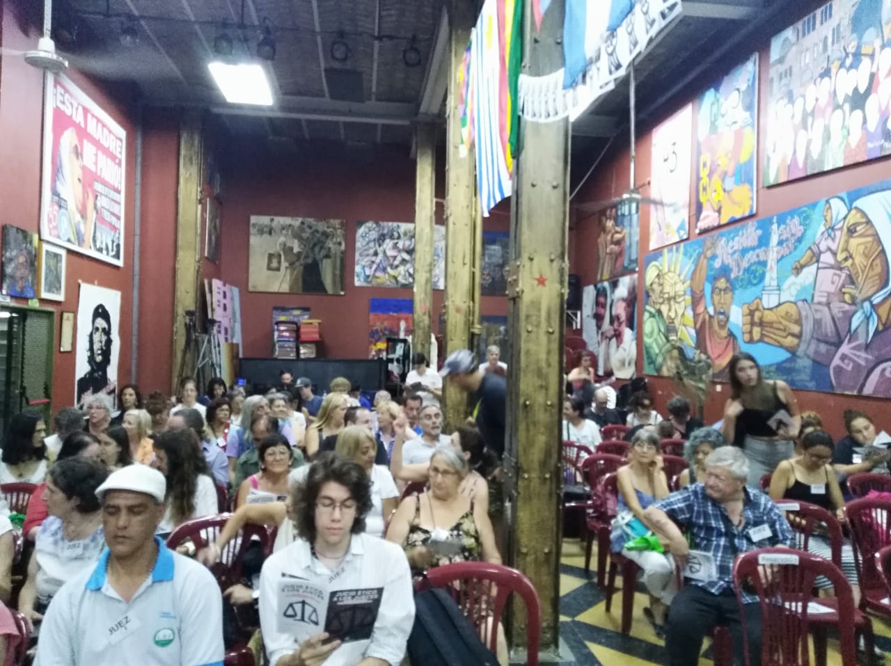 El formato fue el de un juicio popular en el que la nutrida concurrencia, que sobrepasó la capacidad de la sala, se constituyó en el cuerpo de jueces. Cada uno tenía una identificación de juez, culminando en la condena social a jueces y fiscales cómplices del actual gobierno, que día a día avasalla los derechos del pueblo.