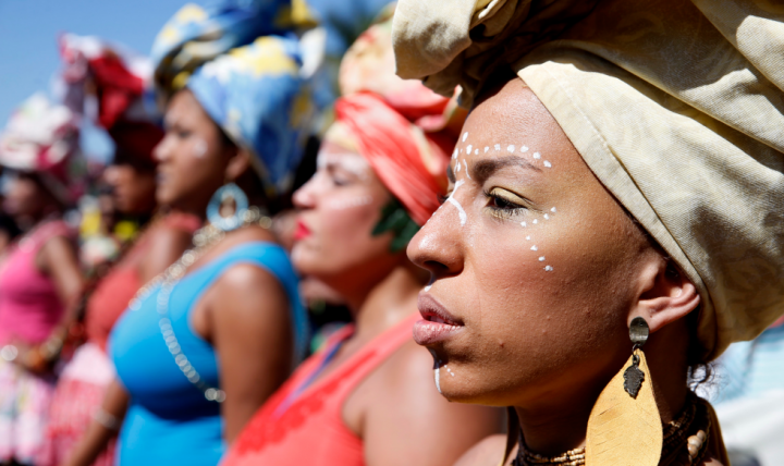 Leí que la inclinación entre el cuello y la cabeza de los negros tardó siglos en alcanzar los noventa grados exactos, de modo que nuestros ojos ahora parecen estar a la misma altura que los ojos de nuestros colonizadores. Es bonito caminar por ahí y ver a tantas mujeres negras mirando el horizonte de la misma manera y tratando de educar a las siguientes generaciones para que el cuello no vuelva a caer. Cuando las veo en las calles, en mis espacios de trabajo y de actividad política, es como si participara en la subversión del tiempo y viera a través de las retinas ajenas, un espejo de las mías, la existencia de las mujeres que las precedieron, de sus predecesoras, de aquellas que llevaron a cabo una ardua lucha para que pudiéramos, no sin dificultades, estar en posición mejor, ocupando con integridad los territorios devastados de nuestras propias vidas. Por supuesto que en las últimas épocas pasamos –de una manera muy colectiva– a mirar a través de nuestros ojos con sed de igualdad, como si mirásemos a través de los ojos de nuestras madres y abuelas.