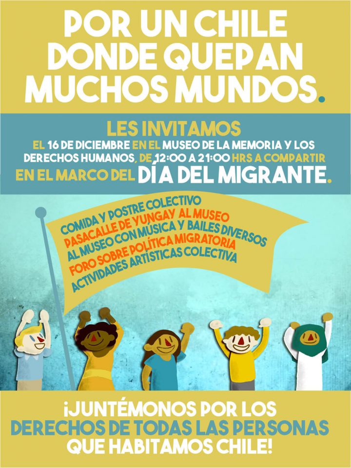 Como una forma de reflexionar sobre las consecuencias de dicha postura y sobre la necesidad y urgencia de que Chile cuente con una ley migratoria que respete, consagre y promueva los derechos humanos es que este domingo 16 de diciembre a contar del medio día se realizará el encuentro “Por un Chile donde quepan muchos mundos” en el Museo de la Memoria y de los Derechos Humanos, para conmemorar el Día Internacional de las Personas Migrantes y los 70 años de la Declaración Universal de los Derechos Humanos, relevando el cruce y pertinencia de estos últimos en lo que respecta a las personas en movilidad, concibiéndolas como sujetos de derecho.