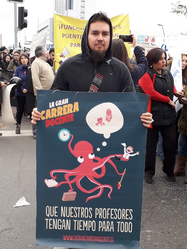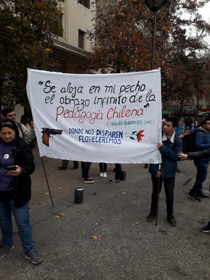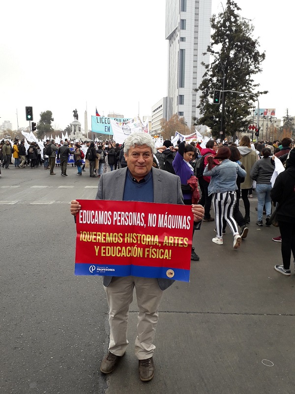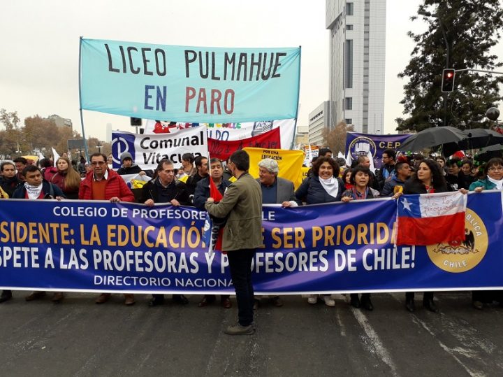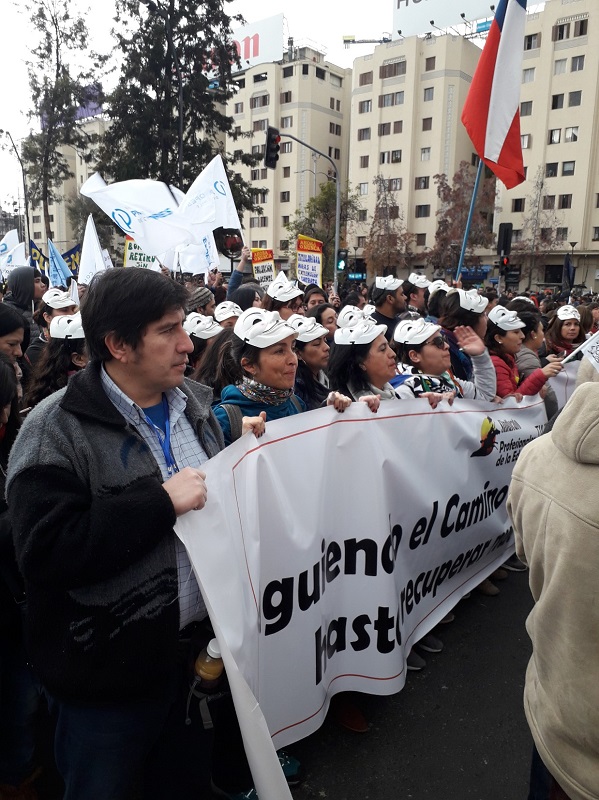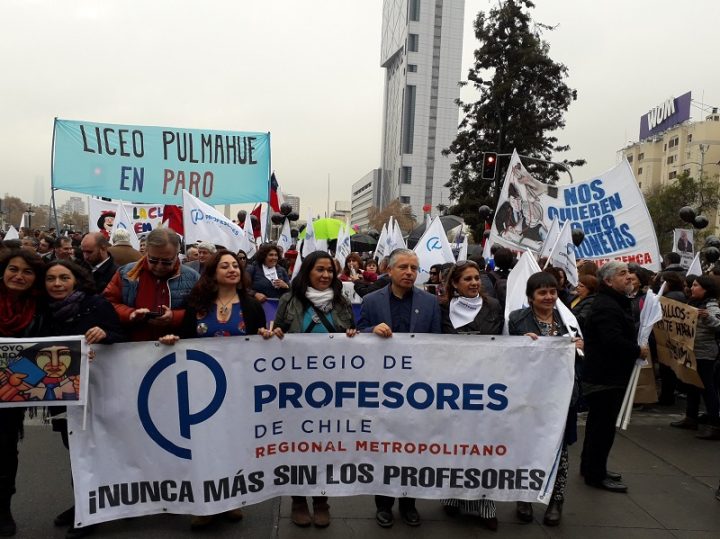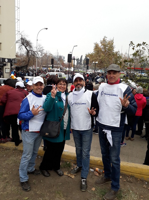 “¡Fuerza, profes!” se ha convertido en frase habitual y hashtag en las redes sociales ante la movilización masiva de los docentes chilenos. Más de 75 mil manifestantes repletaron este jueves 6 de junio la calzada sur de la Alameda (la principal vía de Santiago), muchos de ellos recién llegados de regiones en uno de los 150 buses que los transportaron, mientras en otras ciudades del país se realizaban manifestaciones en paralelo con los profes que no pudieron venir. Desde mi punto fijo como voluntario del cordón de seguridad del Colegio de Profesores en la Plaza Italia, desde donde partía la marcha, estuve una hora y media viendo pasar gente, encauzándola la calzada sur mientras detrás de mí había otro cordón, pero de Carabineros (o “pacos”) fuertemente armados. Ya desde temprano en la mañana tenían aislada con vallas la explanada frente al Teatro de la Universidad de Chile. A pesar de ser una manifestación autorizada, fueron haciendo que quienes iban llegando se desplazaran a los alrededores de la estatua a Manuel Rodríguez, al inicio del Parque Bustamante. Más tarde la cantidad de gente los superó, y tuvieron que quitar las defensas para que los manifestantes fueran llenando la explanada antes vedada. El cordón de voluntarios de seguridad fue importante para ir guiando al creciente número de personas.
