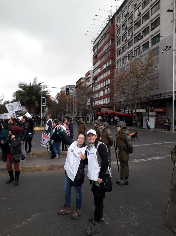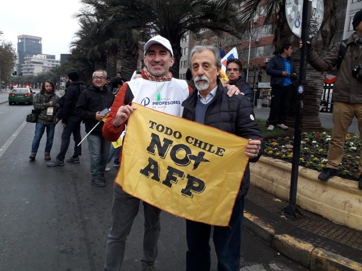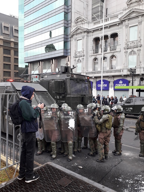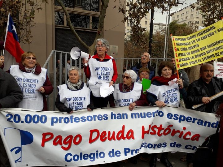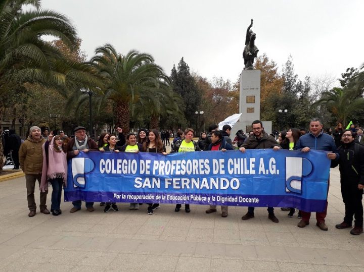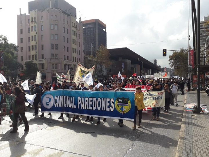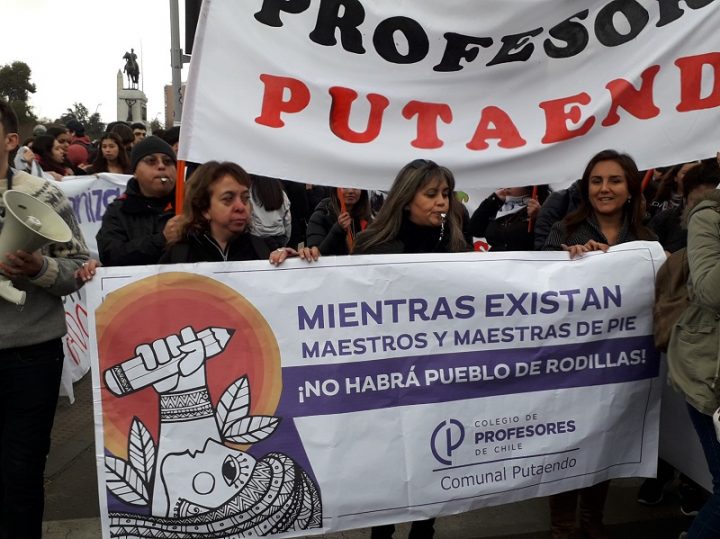 “¡Fuerza, profes!” se ha convertido en frase habitual y hashtag en las redes sociales ante la movilización masiva de los docentes chilenos. Más de 75 mil manifestantes repletaron este jueves 6 de junio la calzada sur de la Alameda (la principal vía de Santiago), muchos de ellos recién llegados de regiones en uno de los 150 buses que los transportaron, mientras en otras ciudades del país se realizaban manifestaciones en paralelo con los profes que no pudieron venir. Desde mi punto fijo como voluntario del cordón de seguridad del Colegio de Profesores en la Plaza Italia, desde donde partía la marcha, estuve una hora y media viendo pasar gente, encauzándola la calzada sur mientras detrás de mí había otro cordón, pero de Carabineros (o “pacos”) fuertemente armados. Ya desde temprano en la mañana tenían aislada con vallas la explanada frente al Teatro de la Universidad de Chile. A pesar de ser una manifestación autorizada, fueron haciendo que quienes iban llegando se desplazaran a los alrededores de la estatua a Manuel Rodríguez, al inicio del Parque Bustamante. Más tarde la cantidad de gente los superó, y tuvieron que quitar las defensas para que los manifestantes fueran llenando la explanada antes vedada. El cordón de voluntarios de seguridad fue importante para ir guiando al creciente número de personas.
