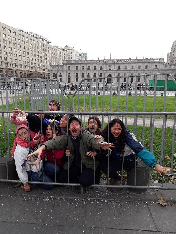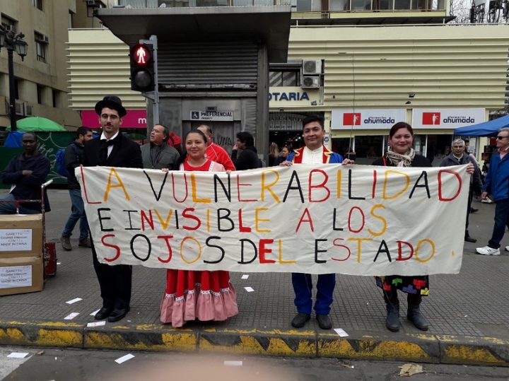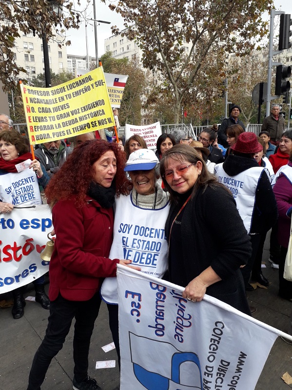 En la parte delantera de la Marcha se desplegó la pancarta principal, sostenida por los principales dirigentes del Magisterio y su presidente Mario Aguilar. Tras ellos iban todo tipo de banderas y pancartas, muchas del Colegio de Profesores, y muchas otras de los diferentes comunales de todo el país, desde Antofagasta a Chiloé, pasando por Putaendo, Valparaíso, Chillán, Temuco, Chonchi, La Calera, Vicuña, Canela, Coquimbo y un largo etcétera. También, por supuesto, de todas las comunas de la región metropolitana de Santiago. Además, participaron estudiantes secundarios de la ACES, agrupaciones de apoderados, universitarios de la CONFECH, feministas de la Coordinadora 8 de Marzo y muchas otras organizaciones sociales y comunitarias. Fue una marcha verdaderamente multitudinaria: gente de todas las edades y procedencias, algunas disfrazadas y portando ingeniosas pancartas, pasaban y pasaban. En un momento muy especial se detuvieron frente al palacio de La Moneda los docentes que llevan años esperando el pago de la deuda histórica: hay algunos que incluso han fallecido esperando poder jubilarse.