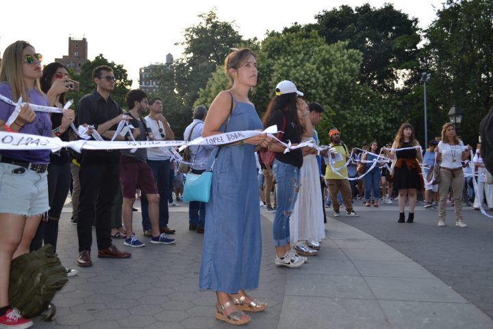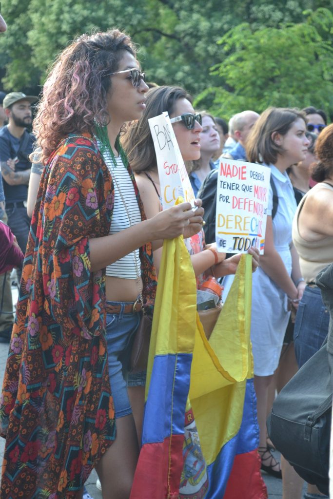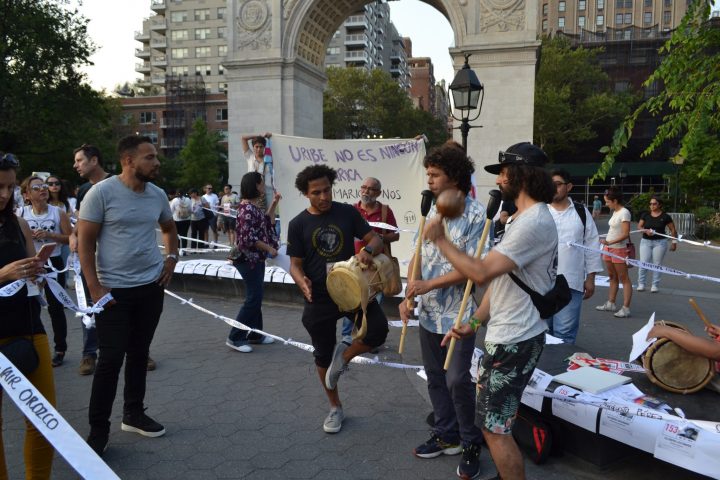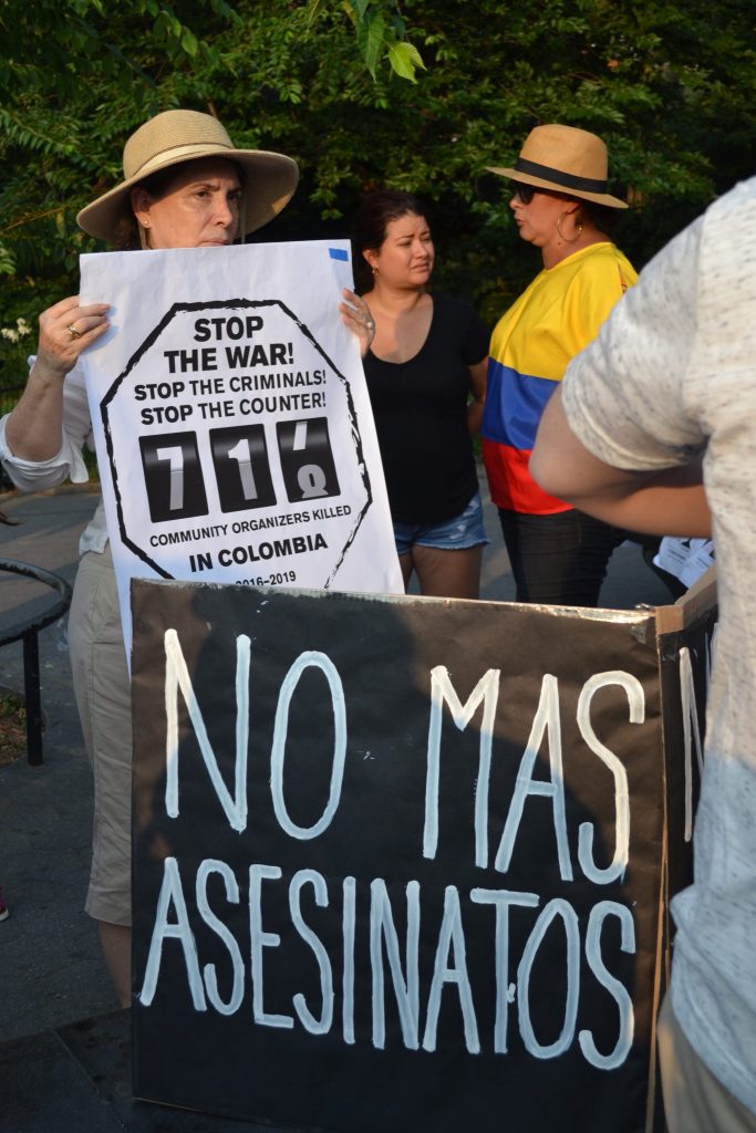 Nueva York – 27 de Julio 2019. En el Parque Washington Square, estudiantes universitarios, intelectuales, artistas, músicos, ciudadanos, organizaciones sociales; políticos y activistas, se movilizan para rechazar y pedir que paren los asesinatos de las lideresas y líderes sociales, políticos, comunitarios, indígenas, campesinos en Colombia. Se exige que deje de ser un delito luchar por los derechos humanos. Los asistentes gritaban al unísono ¡No más, nunca más!, ¡No más impunidad!, ¡No más asesinatos!, ¡No más Uribe!, ¡No más guerra!, ¡Paz para Colombia!.