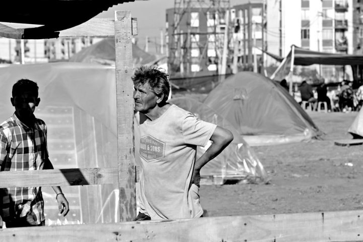 Empieza a hundirse el sol en Cerro Navia, en Barrancas. Tienen que organizarse para la asamblea de la noche y resolver los turnos de guardia del terreno. Como pañuelos vibrantes, se levantan sobre las carpas banderas de Chile, del Wallmapu, de Haití. Un viejo se toma un respiro luego de martillar sin tregua sobre madera y plástico. El cielo enrojece.