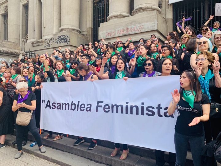 A eso del mediodía de hoy, pañuelos verdes y morados se aparecieron en el frontis de la Biblioteca Nacional. La idea era dar a conocer la recién creada Asamblea Feminista, integrada por importantes organizaciones como La Morada, Humanas, Miles Chile, OCAC, Abofem, entre otras-, y denunciar los graves hechos de violencia político sexual.