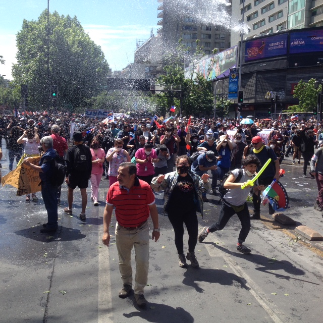 No se trata de que existe todavía alguna organización o grupo de organizaciones sociales con la capacidad y autoridad popular suficiente para convocar por sí sola a las incontables personas que participan a diario y de manera exponencial en las manifestaciones. Al respecto, la crisis del sistema de partidos políticos y de aglutinamientos sociales dentro y fuera de la institucionalidad, es la norma hasta ahora. Ocurre sí, que la convocatoria a huelga general de este 23 de octubre, en efecto, contó con la asistencia de sindicatos, gremios y la autorización para marchar desde la Plaza Italia de Santiago hasta la calle Santa Rosa, hecho que, felizmente, permitió una caminata de inestable tranquilidad por un par de horas. Otro tanto ocurrió en Concepción, Valparaíso y otras localidades.
