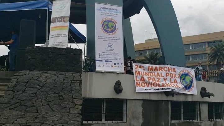 El ambiente frío por la lluvia, lo empezó a calentar David Muñoz representante de la Universidad Nacional que se hizo presente, para brindar su mensaje a favor de la Paz y de apoyo a la 2da Marcha Mundial.