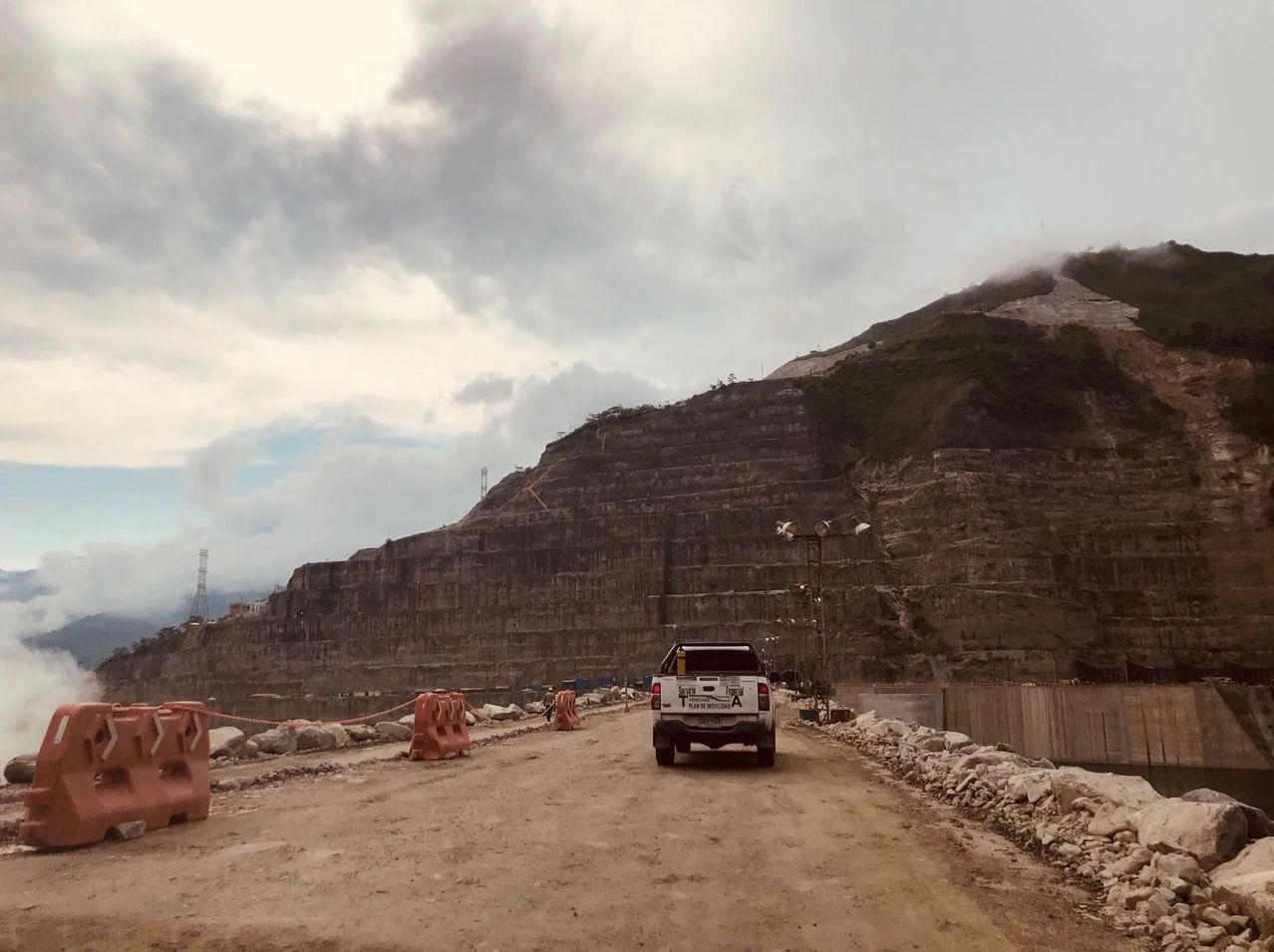 La ruta hacia las obras es un camino privado transitable solo con escoltas de la empresa. Dos camionetas de EPM nos guiaron, una delante y la otra detrás de nosotros, por todo el camino. Después conseguimos parar en un punto con una vista espectacular del río, el valle y el muro de las lamentaciones al fondo, impertérrito.