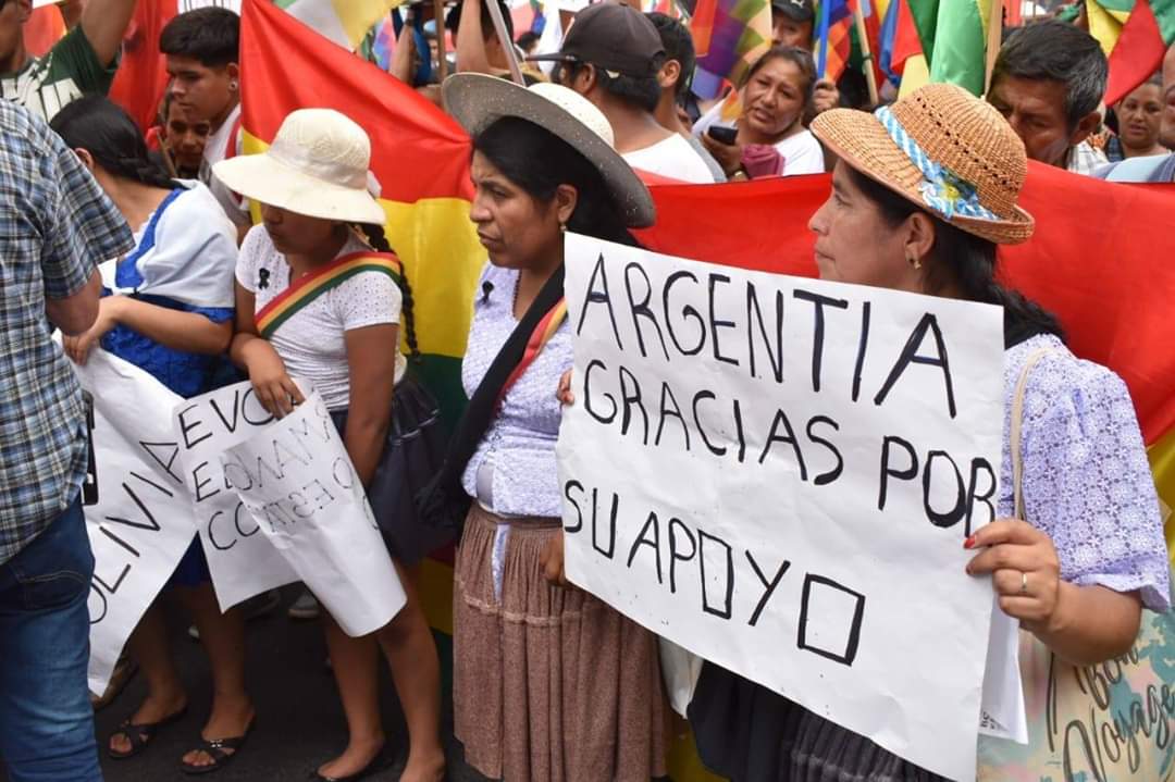 Una señora bajita, de unos 60 años, con un aguayo cruzado en el pecho y un sombrero se afirma en la baranda que protege la vereda para ver pasar la manifestación. “Soy de Yungas y hace más de 20 años que vivo en Argentina. Quiero acompañar a mi pueblo y estoy muy orgullosa por cómo nos está acompañando el pueblo argentino. Me emocioné y lloré. Queremos que vuelva nuestro presidente, porque desde que estuvo él no pasaron estas cosas. Gracias por acompañarnos en este momento cuando más necesitamos. Gracias Argentina”.