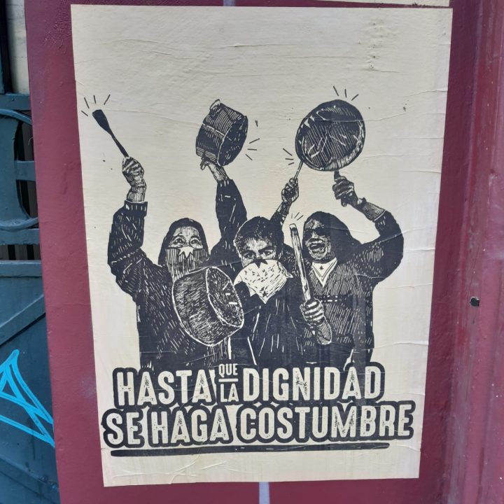 Las cacerolas suenan cada vez que Piñera miente con alevosía por televisión, es decir, cada vez que habla. Los carros policiales son enchastres coloridos, pinturas de Pollock. Las miradas en las calles se sostienen, las sonrisas se ofrecen y el orgullo por “los primera línea” o “los sanitarios” se esparcen.