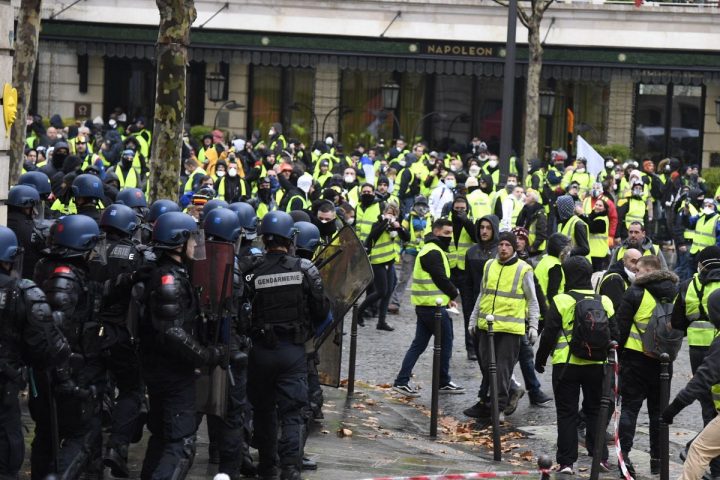 El gobierno tardó algo en reaccionar. Pero a partir del 4º Acto parisino, el 8 de diciembre, 12 vehículos blindados de la gendarmería pisaron por primera vez los adoquines de los Champs Élysées. A partir de ese día, las violencias policiales extremas no cesaron. Entre el 17 de noviembre y el 4 de febrero, gendarmes, CRS y la temible Brigade Anti-Criminalité (BAC) dispararon – según fuentes oficiales – la friolera de 122 balas de goma (LBD), 4942 granadas de fragmentación, 1428 granadas lacrimógenas (aderezadas en algunos casos – según algunas acusaciones – con cianuro, provocando vómito y lesiones graves), las cuales arrancaron 5 manos, destrozaron 24 ojos, provocaron centenares de heridas en la cabeza y dieron lugar a 400 encarcelamientos.