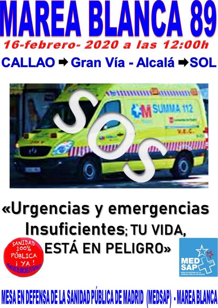La mesa en defensa de la sanidad pública de Madrid, MEDSAP – Marea Blanca, ha celebrado la 89a marea blanca bajo el lema “urgencias y emergencias insuficientes. ¡Tu vida en peligro!”
