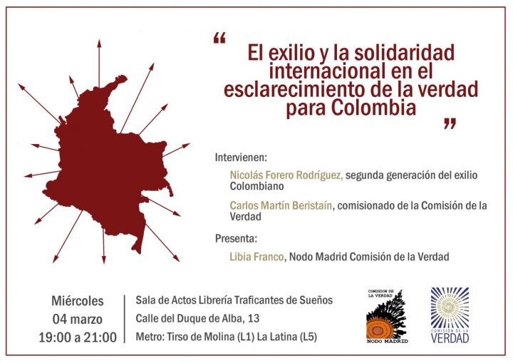 Además de este contacto directo con los medios, el Comisionado Beristaín participará en un acto público sobre “El exilio y la solidaridad internacional en la construcción de la Verdad para Colombia”. Estará acompañado de un miembro de la segunda generación del exilio, Nicolás Forero Rodríguez y de Libia Franco integrante del Nodo-Madrid.