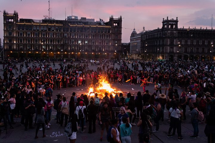 15. Las mujeres levantan el brazo frente al fuego, puño cerrado, en señal de lucha.