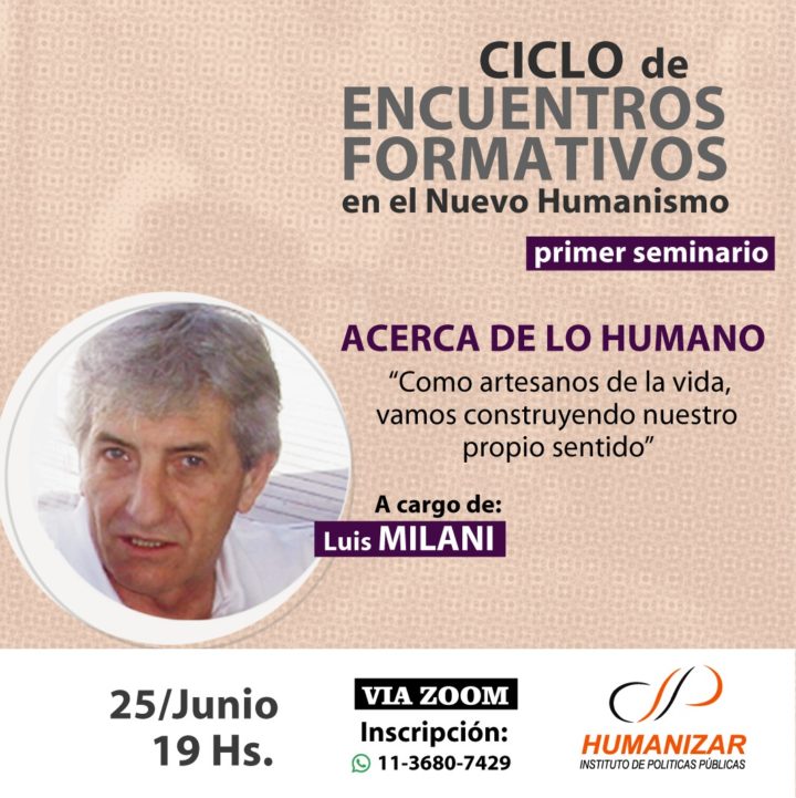 El próximo jueves 25 de junio, el Instituto Humanizar realiza el primer seminario del ciclo de encuentros formativos en el Nuevo Humanismo titulado «Acerca de lo humano – Como artesanos de la vida vamos construyendo nuestro propio sentido», a cargo de Luis Milani.