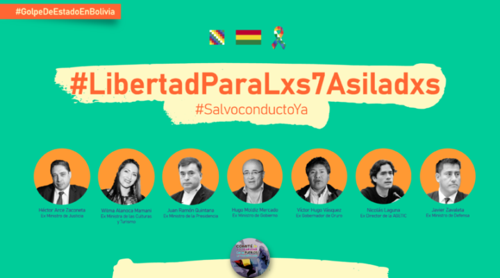 El Comité de Solidaridad con los Pueblos Latinoamericanos, la Mesa de Trabajo por los DDHH de Córdoba Argentina y la Facultad de Filosofía y Humanidades de la Universidad Nacional de Córdoba, junto a ALBA- Suiza, Consejo Pro Bolivia Francia, Asociación de Ciudadanxs Argentinos en Francia (ACAF), Colectivo Wiphala, Casa Nuestra América y Bolivia Solidarity Campaign de Inglaterra, anuncian el lanzamiento de una CAMPAÑA INTERNACIONAL POR LA LIBERTAD Y SALVOCONDUCTOS PARA LXS 7 ASILADXS EN LA EMBAJADA DE MÉXICO EN BOLIVIA.