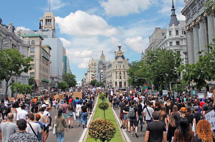 Miles de personas se han movilizado en Madrid en solidaridad con las protestas por el asesinato de George Floyd a manos de un agente de policía en EE.UU. El racismo y la brutalidad policial han sido el desencadenante de la ola protestas que se han extendido mundialmente.