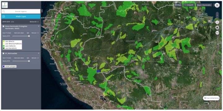 Sylvia Villacís, geógrafa del proyecto, explica: “es una herramienta poderosa para visualización de las presiones, de las amenazas, de la gobernanza forestal. Muchos socios han levantado indicadores sobre gobernanza forestal, monitoreo de bosques, entonces ahí se verá reflejado todo el trabajo. La idea es que esta herramienta sea usada por los veedores y con esto que ellos puedan entender el trabajo que han venido haciendo y su importancia cuando lo vean en el Geovisor, la finalidad de difusión y de entender las dinámicas en cada uno de los territorios dentro de los seis países que están trabajando en Amazonía 2.0”.