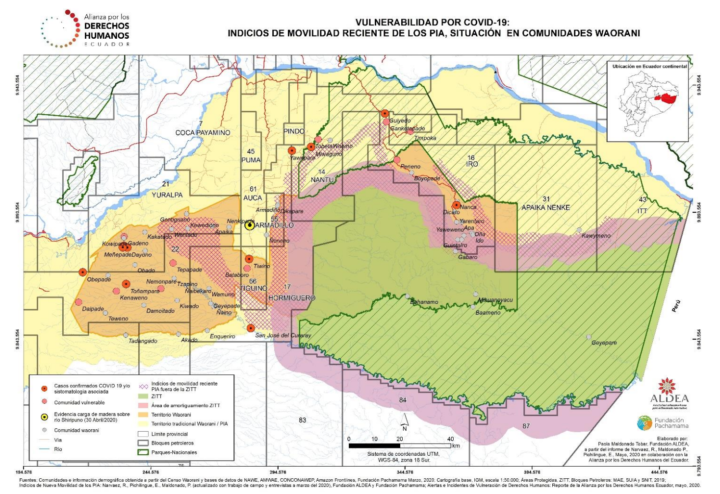 Una nota de: Narváez, Roberto; Maldonado, Paola y Eduardo Pichilingue Ramos (2020). Pueblos indígenas aislados y de reciente contacto (waorani) en la Región del Yasuní: Estado, vulneración de derechos y amenaza a la vida en el contexto de la pandemia de COVID-19. Fundación ALDEA, Fundación Pachamama. Quito, Ecuador.