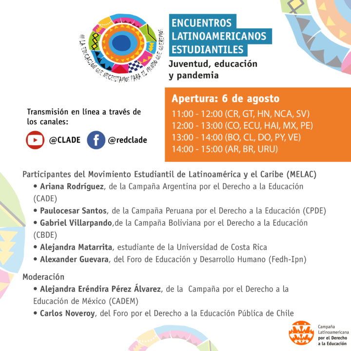 Este evento será realizado el 6 de agosto, de 12:00 a las 13:00 (GMT-5), con transmisión en las páginas de Facebook y Youtube de la Campaña Latinoamericana por el Derecho a la Educación (CLADE). Participarán las y los jóvenes Ariana Rodríguez (Argentina), Paulo César Santos (Perú), Gabriel Villarpando (Bolivia), Alejandra Matarrita (Costa Rica) y Alexander Guevara (Nicaragua). Alejandra Eréndira Pérez Álvarez, de la Campaña por el Derecho a la Educación de México (CADEM) y Carlos Noveroy, del Foro por el Derecho a la Educación Pública de Chile, presentarán el ciclo de encuentros.