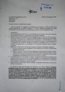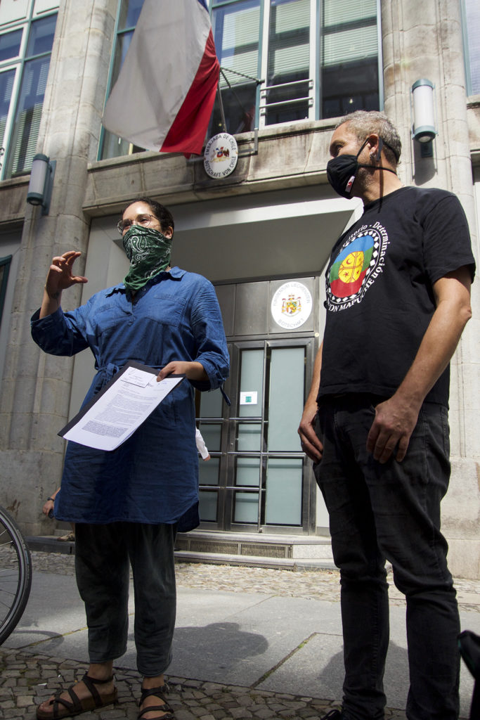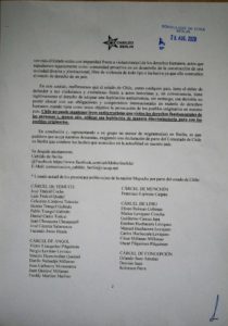 Ayer 20 de agosto la agrupación «Cabildo Berlín», organización integrada por migrantes(as) que viven en está ciudad, hizo entrega de una carta al cónsul de Chile, Don Andrés Pérez Gozalez en la cual, la agrupación adhiere y apoya, las demandas actuales de los pueblos originarios y la nación Mapuche presentadas por dichas comunidades en el territorrio de lo que actuamente conocemos como la república de Chile.