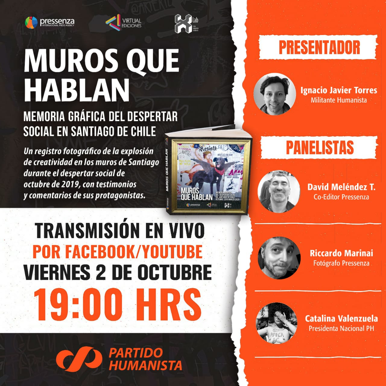 A propósito del 2 de octubre, Día Internacional de la No Violencia, haremos dos conversatorios acerca del libro “Muros que hablan. Memoria gráfica del despertar social en Santiago de Chile. Octubre 2019 – Marzo 2020”, de Riccardo Marinai y David Meléndez Tormen, del equipo de Pressenza Chile.