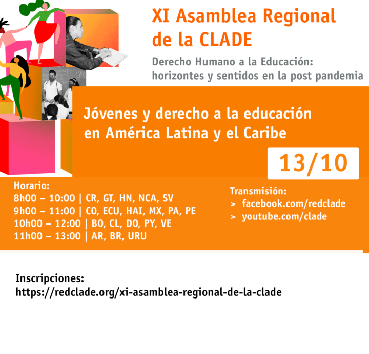 Del 13 de octubre al 26 de enero, foros nacionales, redes regionales y organizaciones internacionales, docentes, estudiantes, investigadores y activistas que integran y son aliados a la Campaña Latinoamericana por el Derecho a la Educación (CLADE), estarán reunidos en la XI Asamblea CLADE para debatir los principales desafíos para la realización del derecho humano a la educación en la actual coyuntura. Están en el programa temas como privatización en la educación, juventudes, educación de personas jóvenes y adultas, primera infancia, criminalización de organizaciones estudiantiles, exclusión y desigualdades, entre otros.