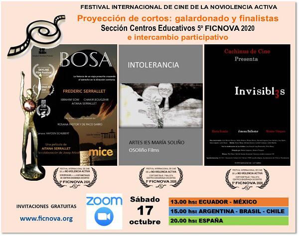 El sábado 17 de octubre el Festival Internacional de Cine de la No-Violencia Activa proyectará el corto galardonado con la “Estela”, el galardón de su 5ª Edición 2020 en la sección de Centros Educativos, junto a los dos cortos finalistas. Lo haremos en un encuentro virtual por Zoom que unirá a participantes de todo el mundo, ante la imposibilidad de celebrar actos presenciales en diferentes ciudades, como es característico de este festival policéntrico. Para ello, es necesario pre-inscribirse aquí