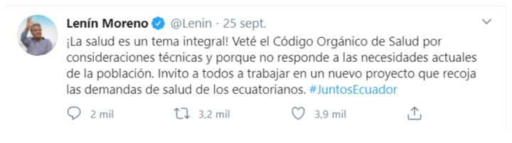 El 25 de septiembre, el presidente Lenin Moreno vetó totalmente el Código Orgánico de Salud aduciendo que, “por consideraciones técnicas y porque no responde a las necesidades actuales de la población”.