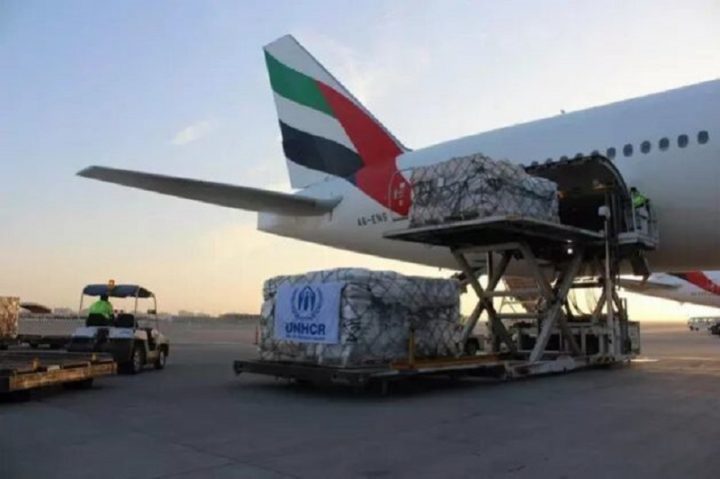 El primero de los cuatro vuelos previstos en el puente aéreo trajo 32 toneladas con ayuda de emergencia de las reservas de Acnur en Dubai (Emiratos Árabes Unidos), e incluyó 5000 mantas, 4500 lámparas solares, 2900 mosquiteros, 200 láminas y 200 rollos de plástico, para usos diversos.