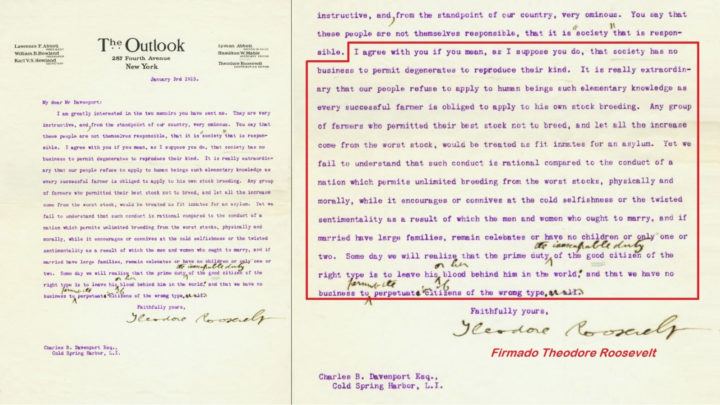Pero no sólo científicos, médicos y filósofos estaban por aplicar la siniestra idea de seleccionar a la gente. El propio T. Roosevelt (1858-1919), ante la llegada masiva de inmigrantes y temor a los desórdenes o la delincuencia, manifiesta estar de acuerdo en la aplicación de los métodos eugenésicos. En correspondencia privada a C.B. Davenport escribió: «Concuerdo con usted, si lo que quiere decir, como supongo, es que la sociedad no tiene por qué permitir que los degenerados se reproduzcan”. En la carta, el bueno de Roosevelt asimila la eugenesia, practicada desde el Estado, con lo que el agricultor o ganadero hace al seleccionar las mejores simientes vegetales o ejemplares animales. Tal cual… Si alguien quiere ver la carta, que siga este vínculo.