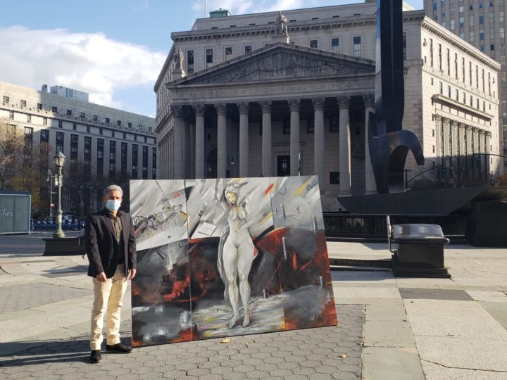 En relación a la obra el pintor, dice. “Esta obra la comencé en el 2019 en New York, y se terminó ahora en el 2020, en plena escena de la pandemia. Está enfocada en los derechos fundamentales de los seres humanos que están siendo violados de manera impune».