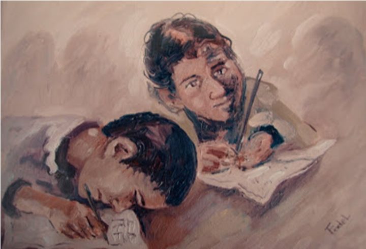 Después de varias horas de viaje por una pista de arena y un sol radiante, llegamos a aquel internado de paredes blancas, rodeado de una línea de tierra elevada que servía de obstáculo y refugio. Yo llevaba la mochila colgada, una botella de plástico llena de agua y cubierta de una tela húmeda. Con la ayuda del maestro fuimos bajando. A mí me dolía la cabeza del vaivén que sentimos en el camión durante el trayecto.