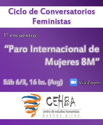 El Centro de Estudios Humanistas de Buenos Aires «Mayte de Galarreta» está organizando un “mes de la Mujer” que se celebrará con un Ciclo de Conversatorios Feministas que tendrán lugar los días sábado a las 16 hs (Punta de Vacas) mediante la plataforma ZOOM. El primer encuentro será sobre el «Paro Internacional de Mujeres 8M», donde referentes de colectivos feministas compartirán su experiencia personal y grupal como activistas feministas, de cara al paro internacional de mujeres convocado para el 8M. El link para participar se obtiene mediante la inscripción previa en https://forms.gle/qCuAZBEbbnAj5kC56. La actividad es libre y gratuita. Los contactos con el CEHBA son: mail: cehbuenosaires@gmail.com; Facebook: Centro de Estudios Humanistas de Buenos Aires
