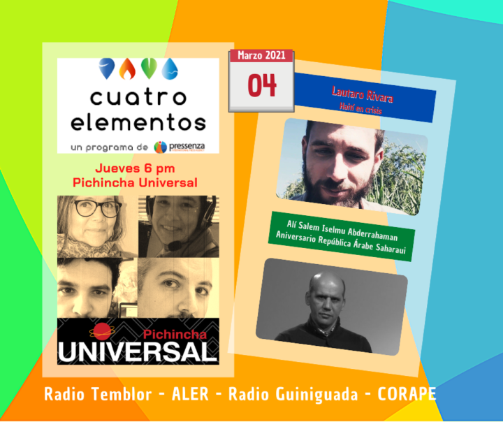 Cuatro Elementos Pressenza Internacional se emite cada jueves por la radio Pichincha Universal de Ecuador y cuenta con la conducción de Nelsy Lizarazo, Blanca Diego, Mariano Quiroga y Domenico Musella.