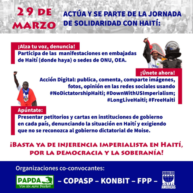 En ese sentido, es importante que este lunes 29 de marzo de 2021 se fortalezcan los lazos de solidaridad de los pueblos del mundo a través de movilizaciones y acciones comunicacionales que busquen, una vez más, visibilizar y denunciar las injusticias que se padecen en Haití.