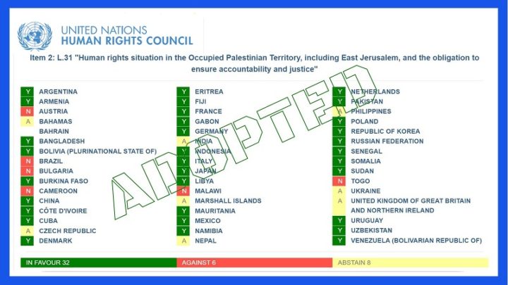 En los últimos días de su sesión anual en Ginebra, el Consejo de Derechos Humanos de Naciones Unidas, máxima instancia de Naciones Unidas en materia de derechos humanos, adoptó la resolución titulada «Human Rights situation in the Occupied Palestinian Territory, including East Jerusalem, and the obligation to ensure accountability and justice» (véase texto completo).