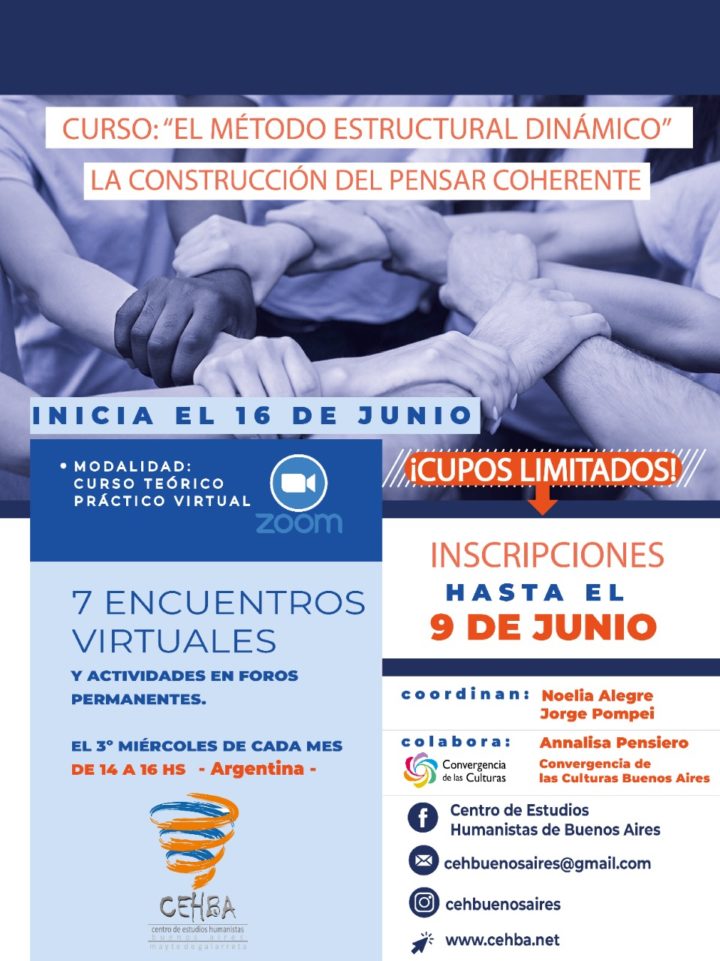 Al curso de Introducción a la Psicología Humanista que se está llevando adelante se agrega ahora el curso sobre «El Método Estructural Dinámico. La construcción del pensar coherente», que se desarrollará en 7 encuentros virtuales, el 3° miércoles de cada mes a las 14 hs, iniciando el miércoles 16 de junio, (Argentina).