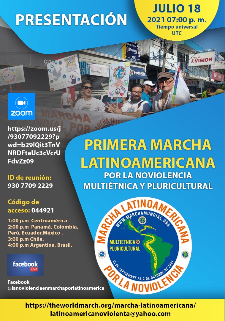 Mañana domingo 18 de Julio a las 15 horas GMT-4, Mundo sin guerras y sin violencia anunciará el lanzamiento de su primera marcha Latinoamericana multiétnica y pluricultural por la paz y la noviolencia.