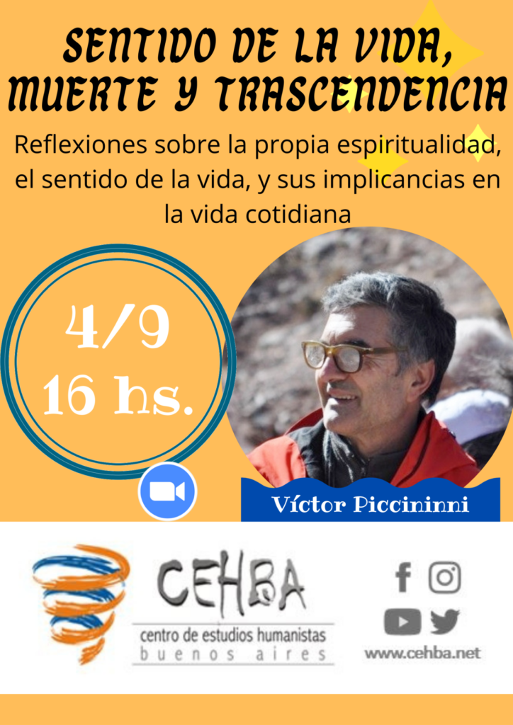 El Centro de Estudios Humanistas de Buenos Aires «Mayte de Galarreta», miembro del Centro de Estudios Humanistas Mundial, está organizando mediante la plataforma ZOOM. Al curso de Introducción a la Psicología Humanista que se está llevando adelante y el taller sobre «Exploración de la atención», se suma el que sobre » Sentido de la vida, muerte y trascendencia» estará a cargo de Víctor Piccininni .