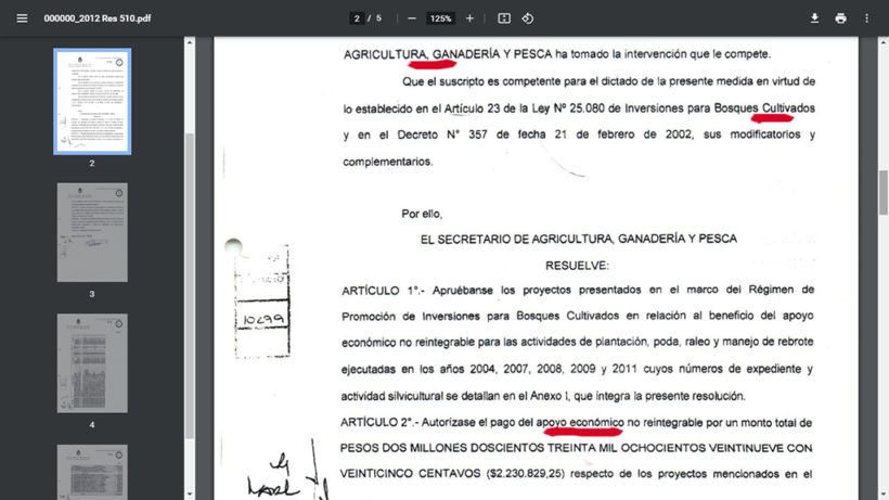 En tercer lugar, y ya en el 27 de agosto de 2012, la familia Rocco recibió un apoyo económico no reintegrable de $8.486,10, enmarcado en la Ley N° 25.08 de Inversiones para Bosques Cultivados. Sorpresivamente, entre los beneficiarios de esa misma ley y de ese mismo año también figura Papel Prensa S.A., beneficiario de $237.744,32; es decir, Papel Prensa S.A. recibió el 10 % del total del apoyo económico de ese año. ¿Por qué se le otorga a una empresa como Papel Prensa S.A. un crédito no reintegrable cuando este beneficio es para emprendedores que se estén iniciando en el “rubro”?