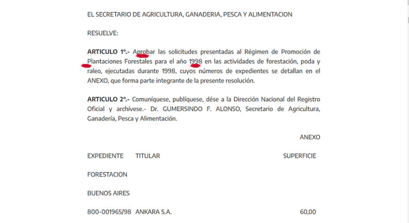 El primer edicto es del 2 de marzo de 1999. Aquí aparece la aprobación del Ministerio de Economía y Obras y Servicios Públicos y la (ex) Secretaria de Agricultura, Ganadería, Pesca y Alimentación, para la aprobación de las solicitudes de Plantación Forestal para ese periodo. En este mismo documento aparecen: 100 hectáreas para la familia Rocco, 200 para Héctor Magnetto (Papel Prensa), 362 para Luciano Benetton (Tierras Sud) y 1000 para Federico Ochoa (Tierras Tecka).