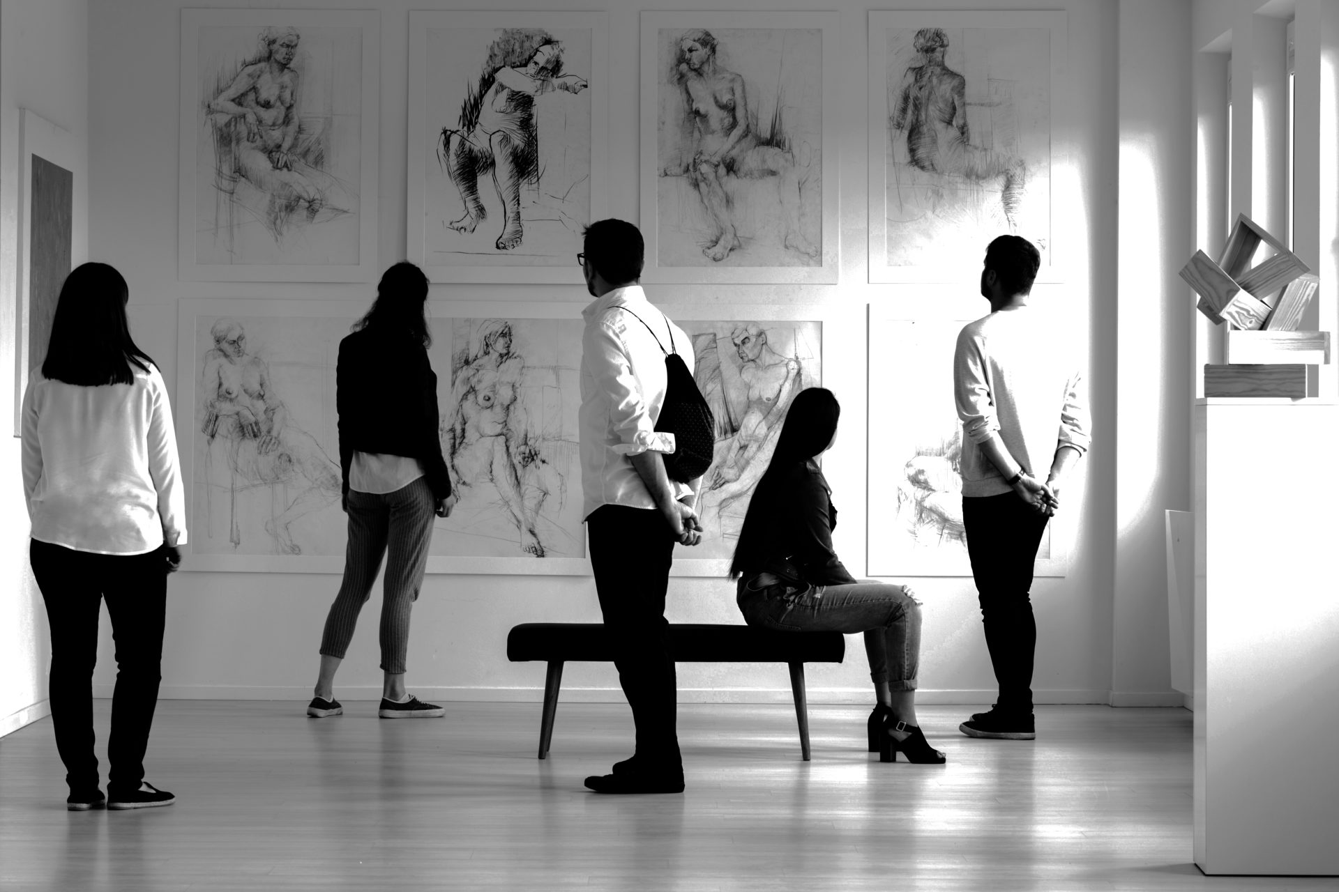 Visitors in art gallery with drawings and sculpture during cultural meeting. Art gallery concept