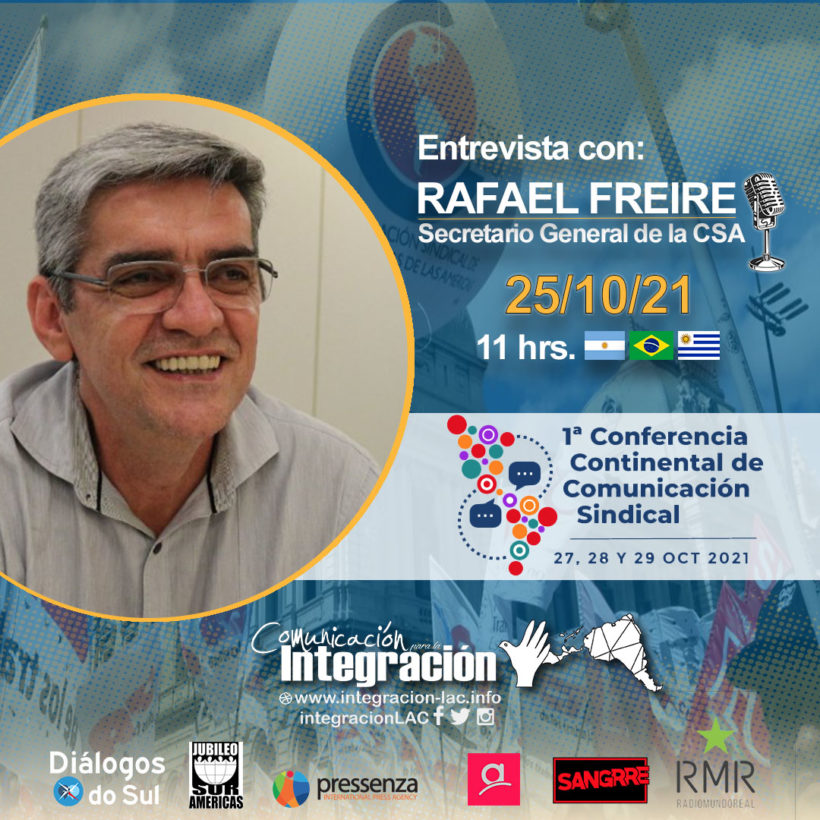 A propósito de la realización de la I Conferencia Continental de Comunicación Sindical, actividad que se llevará a cabo los días 27, 28 y 29 de octubre de 2021, redes y medios integrantes del Foro de Comunicación para la Integración de NuestrAmérica (FCINA) dialogaron con Paulo Freire Neto, secretario general de la Confederación Sindical de Trabajadores y Trabajadoras de las Américas (CSA). Previamente a asumir sus funciones en la CSA, Freire fue dirigente de la Central Única de Trabajadores (CUT) de Brasil y secretario general de la Coordinadora de Centrales Sindicales del Cono Sur (CCSCS).