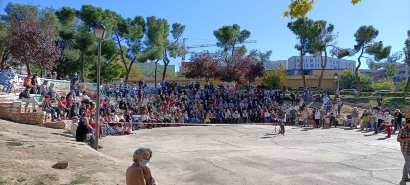 Esa búsqueda de cómo abordar de manera más efectiva la salud fue lo que le llevó a salir fuera del centro a actuar y a tejer redes. Así que, como no podía ser de otra manera, el homenaje siguió sus pasos y salió del centro hacia la calle, congregando a cientos de personas en el anfiteatro del Parque Amós Acero. Y allí, tras una introducción musical a cargo de la Charanga de Vallecas, entre unas y otros, se comenzó a reconstruir la memoria de quién fue Juan Luis Ruiz-Giménez.